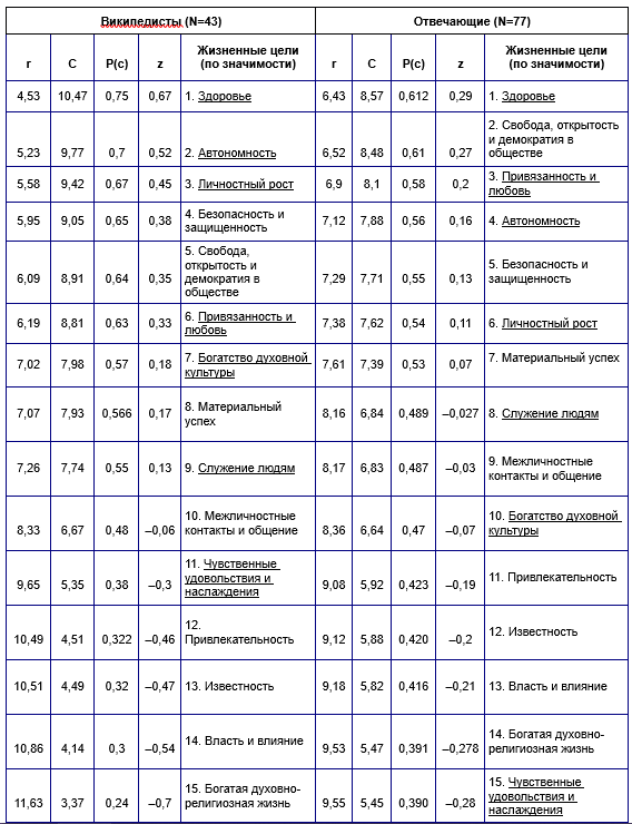 Таким образом, сравнение суммарных z-значений 2-х групп ЖЦ, отражающих их обобщенную относительную важность, демонстрирует (см. табл. 2), что долгосрочная перспектива поведения википедистов и «отвечающих» в большей степени порождается внутренними, а не внешними жизненными целями, что подтверждает выдвинутую нами гипотезу. Таблица 2 Сравнение итоговых z-значений ЖЦ википедистов и отвечающих