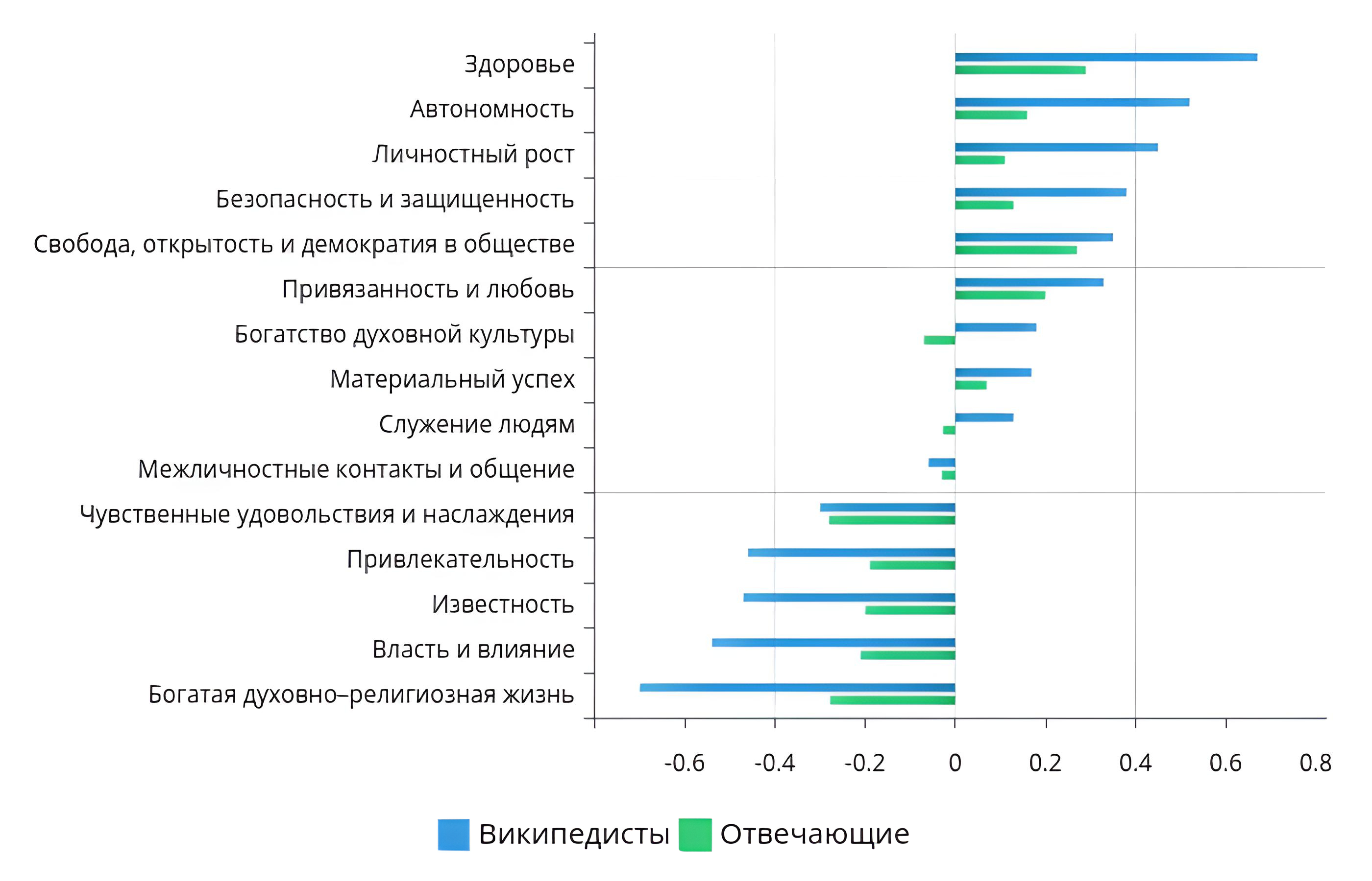 Примечание: для удобной дифференциации внутренние ЖЦ подчеркнуты, а внешние нет. Рисунок 1 наглядно демонстрирует, насколько именно различаются по уровням релевантности ЖЦ у членов Википедии и Ответов. Рис. 1. Интервальные соотношения z-значений жизненных целей участников Википедии и Ответов Поскольку расшифровка результатов выводится из изначально транспарентных формулировок переменных, включенных в методику, то подробное описание каждой ЖЦ представляется излишним. Ниже мы пробуем дать возможные объяснения только по тем ЖЦ, по которым «отвечающие» и википедисты различаются друг от друга (т. е. имеют расхождения по значимости ЖЦ и/или их z-значениям):