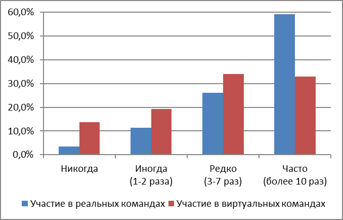Abstract Key words: team building, digital environment, virtual team. ---------------- Динамика общественно-экономического развития общества ставит перед системой высшего образования новые требования к подготовке выпускников вузов. Среди множества процессов, формирующих новые запросы к компетенциям будущих специалистов, остановимся на следующих. Во-первых, возрастающий спрос предприятий на эффективно работающие команды, выдвигает требования к навыкам командообразования, умения кооперироваться и взаимодействовать. Во-вторых, цифровизация всех сфер жизни и деятельности человека, в том числе и в командной работе. Так, согласно опросу службы исследований HeadHunter от января 2019 года, среди работающих соискателей 31% работало удалённо, в период пандемии, этот процент резко возрос. Отвечая требованиям современного рынка труда, для системы высшего образования при подготовке будущих специалистов становятся актуальными вопросы формирования навыков командообразования и организации командной работы студентов в цифровой среде. Подготовка к работе в команде должна начинаться на этапе обучения в ВУЗе. «Эта работа должна быть направлена на изучение самого себя, на формирование организаторских, коммуникативных и лидерских способностей» [1]. В научных трудах авторами выдвигаются различные средства формирования навыков командообразования и умения работать в команде: использование игровых форм [2], выполнение различных профессионально ориентированных проектов [1], организация тренинговых программ [3] и прочие. В рамках данной статьи будут приведены результаты исследования опыта командной работы студентов, реализованной в цифровой среде. В научной литературе, команды, осуществляющие взаимодействие в сети — цифровом, виртуальном пространстве, получили название виртуальные. Таким образом, можно выделить две группы команд: реальные команды, члены, которых контактируют между собой физически, находятся в непосредственной близости друг от друга в одном помещении и виртуальные команды. Под виртуальной командой будем понимать команду «члены которой имеют одну и ту же цель (решение общей задачи проекта), но они отделены друг друга расстоянием, временем и территориальными границами. Члены такой команды общаются посредством электронных средств» [4]. Респондентами исследования выступили бакалавры 1-4 курсов Сибирского федерального университета, в количестве 76 человек (количество опрошенных составляло 88 человек, из них 12 человек не принимали участие в работе виртуальных команд и в дальнейшем исследовании не участвовали). В ходе исследования были использованы методы анкетирования, беседы, тест «Формирование положительной групповой мотивации» В. А. Розановой. Ниже представлены обобщенные результаты исследования. На вопрос «Принимали участие в командной работе?», с вариантами ответов: никогда, иногда (1-2 раза), редко (3-7 раз), часто (более 10 раз), более половины респондентов 59,1% принимали участие более 10 раз, не принимали участия никогда 3,4%. Это подтверждает высокую востребованность командной работы. На вопрос «Являлись участником виртуальной команды?» процент респондентов, принимавших участие более 10 раз значительно ниже 32,9%, при этом значительно возрос процент не участвовавших 13,6%, что говорит о более частом использовании педагогами традиционных форм комадообразования. Про