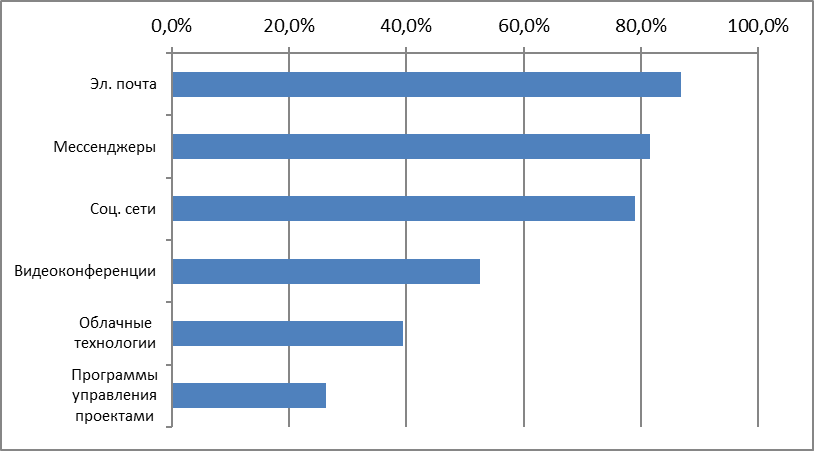 Рис. 1. Процентное соотношение участий в реальной и виртуальной команде Группы дисциплин, в которых виртуальные команды используются чаще всего: информационные технологии, экономические, маркетинг, реклама. Среди наиболее значимых проблем в работе виртуальных команд, по мнению респондентов, являются: неуместный стиль лидерства – 38,2%, проблема построения процессов взаимодействия: программно-техническая – 14,5%; построения коммуникаций в команде – 11,8%; асинхронность коммуникаций –15,8%. Как видно из данных приведенных выше основные сложности коммуникаций связаны с использованием средств ИКТ. Среди ИКТ, используемых в работе виртуальных команд для организации коммуникации и обмена информацией, наиболее часто упоминались (рис 2): электронная почта – 86,8%, мессенджеры (WhatsApp, Viber) – 81,6%, социальные сети (Vk, Facebook) – 78,9%, сервисы видеоконференций (Zoom, Skype, Google Meet) – 52,6%, облачные технологии (Google, Yandex документы) – 39,5%, программы управления проектами (MS Project, Trello) – 26,3%.