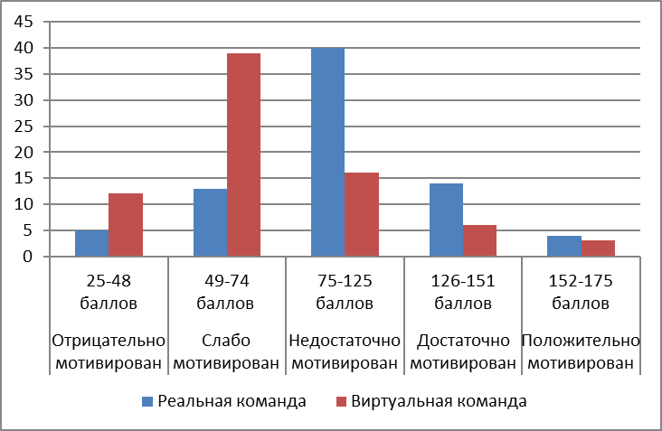 Рис 3. К исследованию групповой мотивации Проведенное тестирование выявило у студентов средний уровень мотивации на работу в реальной команде – 52,6%. Результаты тестирования показали, что в большинстве своем студенты воспринимают команду нейтрально или даже как помеху своей деятельности. Некоторыми студенты оценивали «полезность» группы в наличии более компетентного члена группы, способного оказать помощь, взять на себя поиск информации, решение сложной проблемы, что также свидетельствует о слабой сформированности мотивации на работу в команде. При проведении аналогичного тестирования о работе в виртуальной команде, результаты показали, более низкий уровень мотивации, наибольший процент приходиться на слабую мотивированность – 51,3%. Более низким баллом, по сравнению с реальной командой, были оценены: сплоченность группы, активность членов группы, признание авторитета руководителя, участие членов группы в процессе принятия решений, уровень контроля за действиями каждого члена группы, согласованности действий членов группы, проявление самостоятельности в решении поставленных задач членами группы. С целью проверки зависимости уровня групповой мотивации от формы командообразования, был применен критерий Пирсона χ2. Полученные результаты:![]() ![]() В заключении хотелось бы отметить, что формирование умений работать в команде требует длительного времени и должно осуществляться на протяжении всего обучения в ВУЗе. Помимо практических умений, на должна быть направлена на самодиагностику интересов студента, его способности к выполнению разных ролей в команде, на выработку коммуникативных и организаторских умений, лидерских качеств. Для успешного формирования навыков командообразования и организации командной работы студентов в цифровой среде, необходимо включение в образовательную программу большего объема учебных заданий, связанных с сферой командообразования, планирования и реализации командной работы в цифровой среде. Также следует усилить изучение современных цифровых средств поддержки и управления работой виртуальных команд, позволяющих организовать работу по созданию гипертекста; организации хранения и обработки общих документов; построению интеллектуальных карт, лент времени; ведению общих журналов наблюдений; проведению «мозговых штурмов» и другие.