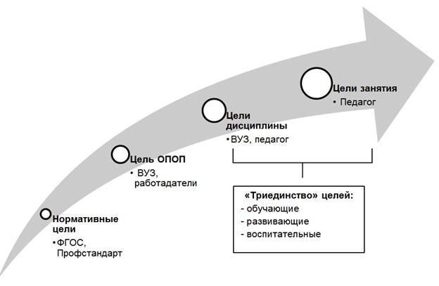 Рис. 1. Иерархическая структура образовательных целей Нормативные цели включают цели подготовки выпускника, сформулированные в Федеральных государственных образовательных стандартах (ФГОС) по отдельному направлению и уровню подготовки: бакалавриат (академический, прикладной), магистратура. Эти цели сформулированы как требования к результатам освоения программы в виде универсальных и общепрофессиональных компетенций. Образовательная программа учитывает требования ФГОС, профессиональные стандарты (при определении профессиональных компетенций), требования работодателя и потребности региона, а также направленность программы (профиль). Цели дисциплины формулируются на основе анализа возможностей учебной дисциплины в формировании компетенций. На следующем этапе целеполагания, сформулированные в общем виде цели, конкретизируются на материале изучения конкретной темы. Цели занятия - последний этап конкретизации целей обучения; он и вызывает наибольшие затруднения у преподавателей при проектировании различных видов занятий. Таким образом, компетенции и индикаторы их достижения - это образовательные цели-ориентиры, они сформулированы в общем виде, т.е. это уровни, которые достаточно удалены от реального учебного процесса и конкретного преподавателя. Эти общие цели должны пройти определенный путь до уровня воздействия обучения на обучающегося, а именно, конкретизироваться и детализироваться. Несмотря на множество существующих технологий и методик, теоретических исследований, посвященных проблеме целеполагания, остается проблемным момент формулировки цели конкретного вида занятия в вузе (лекции, практического занятия, лабораторной работы). Как показывает практика, многие педагоги или вовсе не конкретизируют общие цели (ограничившись индикаторами достижения компетенций), или ставят цели занятия формально и не всегда корректно. А ведь именно от постановки целей зависит выбор содержания и методов обучения конкретного вида занятия, а значит и формирование компетенций. Необходимо отметить также, что многие исследования проблемы целеполагания рассматриваются для уровня общего среднего образования [1 - 4]. Постановке целей обучения в вузе, а тем более в техническом вузе в исследованиях уделяется гораздо меньше внимания [5 - 7]. Для того чтобы осознанно ставить цели и использовать их при построении процесса обучения, нужно знать их классификацию, так называемую таксономию, методику целеполагания. Классификации образовательных целей разнообразны. Одну из первых классификаций создал американский психолог Б.С. Блум (широко известная таксономия Блума), затем появились ее различные версии и дополнения (Л.Андерсон, Д.Кратволь и др.). В нашей стране классификации целей были предложены В.П.Беспалько, В.А.Хуторским, В.С.Безруковой и др. Самая общая классификация выделяет цели обучения (учебные цели), развития и воспитания (рис. 2). С нашей точки зрения, эта классификация является наиболее оптимальной для формулировки целей отдельного занятия. «Целостность педагогического процесса обеспечивается единством целей воспитания, обучения и развития личности...» [8].