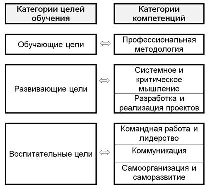 Рис. 2. Классификация целей обучения В июле 2020 года в Федеральный закон об образовании в Российской федерации внесены существенные изменения, касающиеся воспитательной составляющей образовательной программы по всем уровням. Это еще раз подчеркивает особую значимость и приоритет развивающих и воспитательных целей обучения. Во-первых, как известно, каждая компетенция демонстрируются в действии: знания, умения и навыки, личностные качества, мотивация и целевые установки, опыт, потенциал. Здесь, говоря условно, знания, умения и навыки можно соотнести с обучающими целями, а все остальное - с развивающими и воспитательными. Во-вторых, в современных условиях акцент смещается на формирование так называемых компетенций Soft Skills (гибкие навыки). Значительную роль в подготовке будущих инженеров играет математическое образование. Проблема математической подготовки в техническом вузе рассматривалась многими исследователями (Л.Д.Кудрявцев, Р.П.Исаева, В.А.Далингер [8], [9], [10], [11] и др.). Много работ посвящено проблеме формирования математической компетентности обучающихся (С.А. Татьяненко, Л.В. Васяк, С.И. Тормасин [12], [13], [14] и др.). Однако, в этих исследованиях недостаточно изучена проблема проектирования и конкретизации целей обучения математике в техническом вузе. При постановке целей обучения математике в техническом вузе необходимо исходить из компетенций и индикаторов их достижения как образовательного результата, а также из места и роли математики в будущей профессиональной деятельности и из возможностей самой математики в формировании компетенций. Анализ сущности математического знания и его приложений показал, что математика занимает достойное место в формировании компетенций. Более того, на предметную область математики можно спроектировать компетенции разных видов: как универсальных так и общепрофессиональных. На рисунке 3 представлена взаимосвязь и корреляция между категориями традиционных целей обучения и категориями универсальных и общепрофессиональных компетенций, которые могут быть сформированы в процессе изучения математике в техническом вузе (на примере направления подготовки Химическая технология, Федеральный государственный образовательный стандарт высшего образования – бакалавриат по направлению подготовки 18.03.01 Химическая технология, утвержденный приказом Министерства науки и высшего образования Российской Федерации от 07.08.2020 года № 922).
