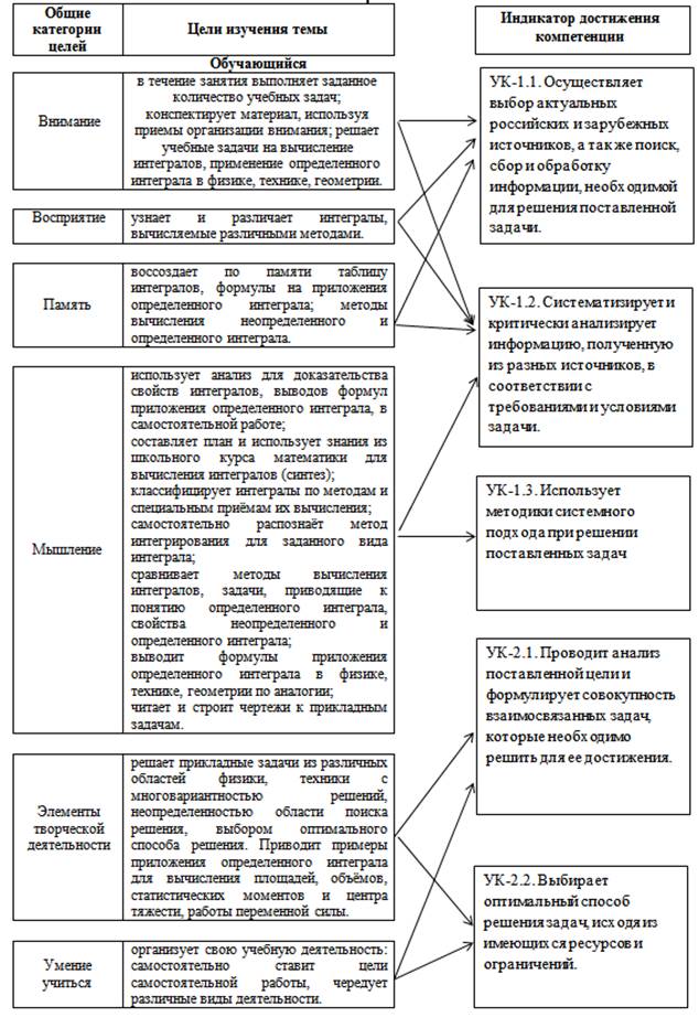 Рассмотрим конкретизацию целей обучения математике на примере темы «Интегральное исчисление функций одной переменной». Интегральное исчисление – вторая часть курса математического анализа, традиционно изучаемая на первом курсе технического вуза. Само понятие интеграла наряду с понятием производной и дифференциала является фундаментальным понятием математического анализа. Кроме того, определенный интеграл имеет целый комплекс технических приложений. Возможно продемонстрировать переход от абстрактных математических понятий к их прикладному значению в физике, других смежных науках, а далее – их применение в профессиональных областях. В качестве примера рассмотрим формулировку развивающих целей обучения математике раздела «Интегральное исчисление функции одного переменного» (рис.1). На рисунке 1 эти цели соотнесены с индикаторами достижения компетенций.