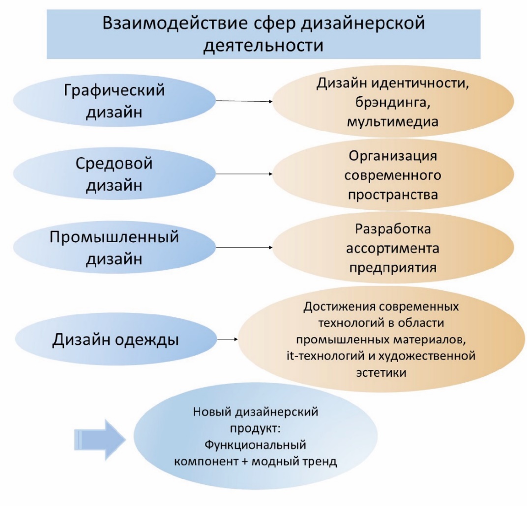 Рис. 1. Взаимодействие сфер дизайнерской деятельности В то же время, на первый план выходит стратегический дизайн и дизайн-мышление, в связи с чем, и происходит объединение специалистов различного профиля. Особое внимание уделяется фирменному стилю, изучаются основные направления и композиционные приемы. Фирменный стиль — это один из наиболее востребованных и современных видов подачи информации и рекламы собственного бренда, продукции и услуг. Он является одним из способов маркетинговых приёмов. Фирменный стиль включает в себя цветовые, графические, шрифтовые и другие компоненты, в совокупности объединяющие информацию и создающие визуализацию фирмы, бренда, товара. Важным элементом является единый композиционный подход к оформлению, цветовому решению и символике, используемой для оформления упаковки, рекламы, документации, авторских изделий и коллекций. В свою очередь, логотип, фирменные цвета и другие элементы стиля помогают сформировать конкретный образ в массах, тем самым, облегчив процесс продвижения товаров и услуг на рынке [3]. Функции фирменного стиля: