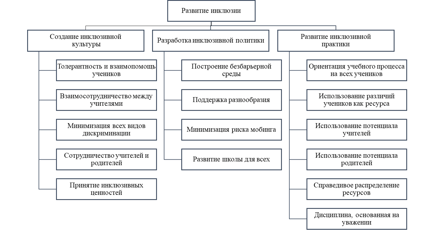 Abstract Key words: inclusive education, inclusive educational environment, inclusive school transformation, subjective well-being. ---------------- Инклюзивная трансформация школы влечет за собой не только организационные изменения, но, прежде всего, изменения в образовательных и человеческих отношениях. Как показывает практика, в пространстве отношений и возникают наибольшие трудности. Медленные темпы развития инклюзии в общем образовании, наличие проблем и рисков, с которыми сталкиваются все субъекты образования, стали предпосылками для разработки и реализации проекта, направленного на выявление и обоснование теоретико-методологических основ субъективного благополучия участников образовательного процесса в условиях инклюзивной трансформации школы. В основу исследования положен подход к развитию инклюзии в школе Т. Бута и М. Эйнскоу [1], где выделены три аспекта: создание инклюзивной культуры, разработка инклюзивной политики и развитие инклюзивной практики, которые выступают в интерпретации авторов показателями инклюзии. Данные показатели рассматриваются нами как компоненты инклюзивной образовательной среды, включающие: