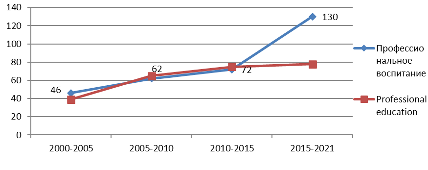 Abstract Key words: education, future teacher, educational work of universities, professional education. source base. ---------------- В традициях высшего педагогического образования России - ориентация не только на профессиональную подготовку специалистов, но и на реализацию важнейшей социальной функции – воспитание человека, профессионала [1, c. 18]. Исследования воспитательной работы вузов в последнее время приобретают особую актуальность. В рамках настоящей статьи приводятся результаты работы по определению истоковедческой базы исследования опыта профессионального воспитания будущих педагогов. Первая составляющая этой базы - материалы крупных научных издательств, архивов препринтов, публикаций на сайтах университетов, научных обществ и других научных организаций. Метод работы с этой базой – работа в поисковой системе Google Scholar. Анализ числа материалов, представленных в поисковой системе Google Scholar, по полным текстам научных публикаций позволил констатировать рост числа интересующих нас публикаций. Так, например, по данным Google Scholar за период 2000 – 2021 гг. расширенный поиск словосочетания «профессиональное воспитание» на русском языке по индикатору «в любом месте статьи» выдает 17900 результатов. Сужение поиска «по заголовку статьи» выдает 274 результата. Расширенный поиск аналогичного англоязычного словосочетания «professional education» ожидаемо выдает значительно большее число найденных материалов - 486 000. Динамика числа материалов, содержащих русскоязычное словосочетание «профессиональное воспитание» и англоязычное «professional education» за последние двадцать лет по пятилетнему интервалу в относительных единицах представлена на рис. 1.