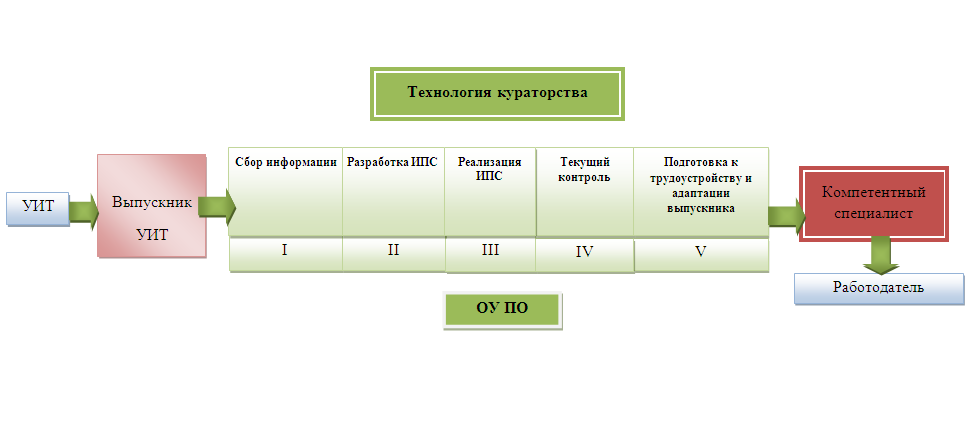 Нами изучен опыт постинтернатного сопровождения различных регионов страны. В данной статье мы приводим лишь графическое отображение этих моделей, более детальное описание их функционирования можно найти в учебно-методическом пособии «Проблемы постинтернатного сопровождения выпускников сиротских учреждений» (2021) [2]. На рис. 1 изображена схема модели технологии кураторства сопровождения социальной адаптации выпускника-сироты учреждения интернатного типа (УИТ). Эта модель [3] разработана и апробирована Центром профориентации и постинтернатного сопровождения ГОУ «КРИРПО» в Кемеровской области. Имеется нормативная база, прописаны этапы, алгоритм работы куратора, его функциональные обязанности, индивидуальный маршрут сопровождения, социальный паспорт сироты и т.д.