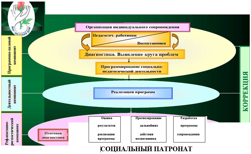 Рис. 1. Модель технологии кураторства Центра профориентации и постинтернатного сопровождения ГОУ «КРИРПО» (Кемеровская область) Интересна структурно-функциональная модель постинтернатного сопровождения детей-сирот МОУ «Детский дом» г. Надыма по повышению уровня социальной адаптации воспитанников на этапе подготовки воспитанников к самостоятельной жизни (Исакова Т.В., Ковальчук О.Н.), (рис. 2). Исакова Т.В., Ковальчук О.Н. считают: «Под системой подготовки понимается специально организованная деятельность воспитанников и воспитателей по выработке у детей-сирот и детей, оставшихся без попечения родителей, знания требований среды, умения организовать свою жизнь и деятельность в соответствии с этими требованиями; качеств, обеспечивающих бесконфликтную интеграцию в среду самостоятельной жизни и деятельности» [4]. В работе прописаны все компоненты модели, диагностическая карты выпускника-сироты, индивидуальная программа реабилитации выпускника.