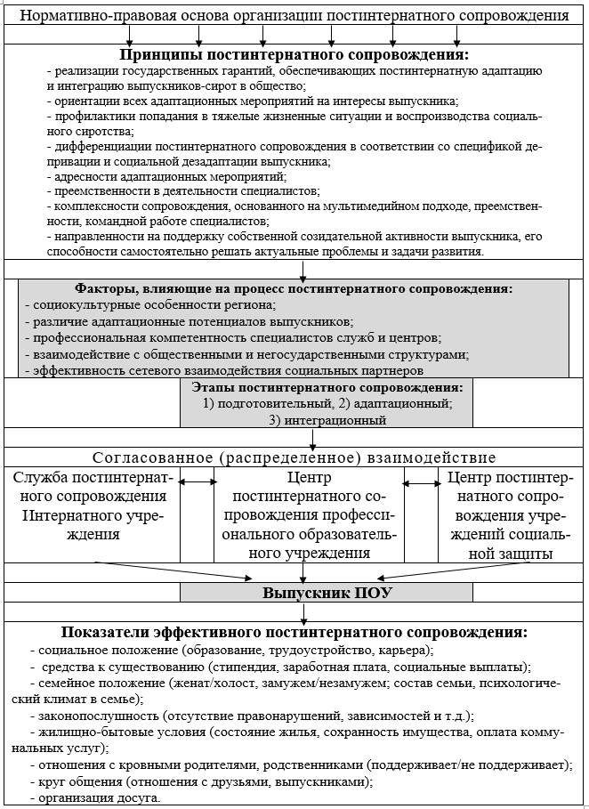 Abstract Keywords: socio-pedagogical support, social adaptation, graduates of orphanages. ---------------- В нашей стране феномен сиротства известен со времен Екатерины Второй. Проблема адаптации сирот к жизни рассматривалась многими исследователями с различных сторон. Социальные проблемы выпускников-сирот хорошо представлены в различных научных трудах - диссертационных исследованиях, монографиях, методических рекомендациях. Основной технологией, встречающейся в исследованиях по этой проблематике, названо социально-педагогическое постинтернатное сопровождение – термин, укоренившийся в научной литературе. Это сопровождение применяется вне зависимости от того, какое учреждение или образовательную организацию закончил выпускник-сирота, вышедший в самостоятельную жизнь. Нормативные акты предусматривают сопровождение и помощь сиротам в жизнеустройстве до достижениями ими 23-летнего возраста. Все сиротские учреждения, в той или иной степени, занимаются постинтернатным сопровождением своих выпускников: работают специальные службы, состоящие из разных специалистов (воспитатели, медицинские работники, психологи и социальные педагоги или социальные работники в зависимости от ведомственной принадлежности сиротского учреждения). Часто в этом случае используется социальное партнерство или межведомственной взаимодействие, так как проблема социальной адаптации сирот – проблема, решаемая разными ведомствами. Передовые организации разрабатывают свои модели постинтернатного сопровождения, предусматривая в них совместную работу с различными учреждениями и ведомствами на основе сетевого взаимодействия. При моделировании постинтернатного сопровождения важно изучать эффективный опыт разных регионов нашей большой страны. Ранее [1] мы проводили анализ различных моделей постинтернатного сопровождения социальной адаптации выпускников-сирот и выделяли следующую их классификацию: