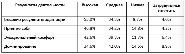 Уровень социально-психологической адаптации тесно ввязан с психологическими характеристиками личности и особенностями ее поведения. Диагностика служит выявлению комплекса психологических проявлений, сопровождающих процесс социально-психологической адаптации. К интегральных показателей такой диагностики относятся: адаптация, интернальность, принятие других, самопринятие, эмоциональная комфортность и стремление к доминированию. Как видно из рассмотрения таблицы 2, реализации разработанной модели на практике поспособствовала социальной адаптации выпускников-сирот Индустриально-судостроительного профессионального лицея. На этом основании в лицее был создан Центр постинтернатного сопровождения социальной адаптации выпускников-сирот, ежегодно разрабатываются индивидуальные программы сопровождения под каждого выпускника, характеризующиеся комплексным и системным характером, целью которых является подготовка сироты в самостоятельно жизни, интеграции его в общество в современных социально-культурных условиях.