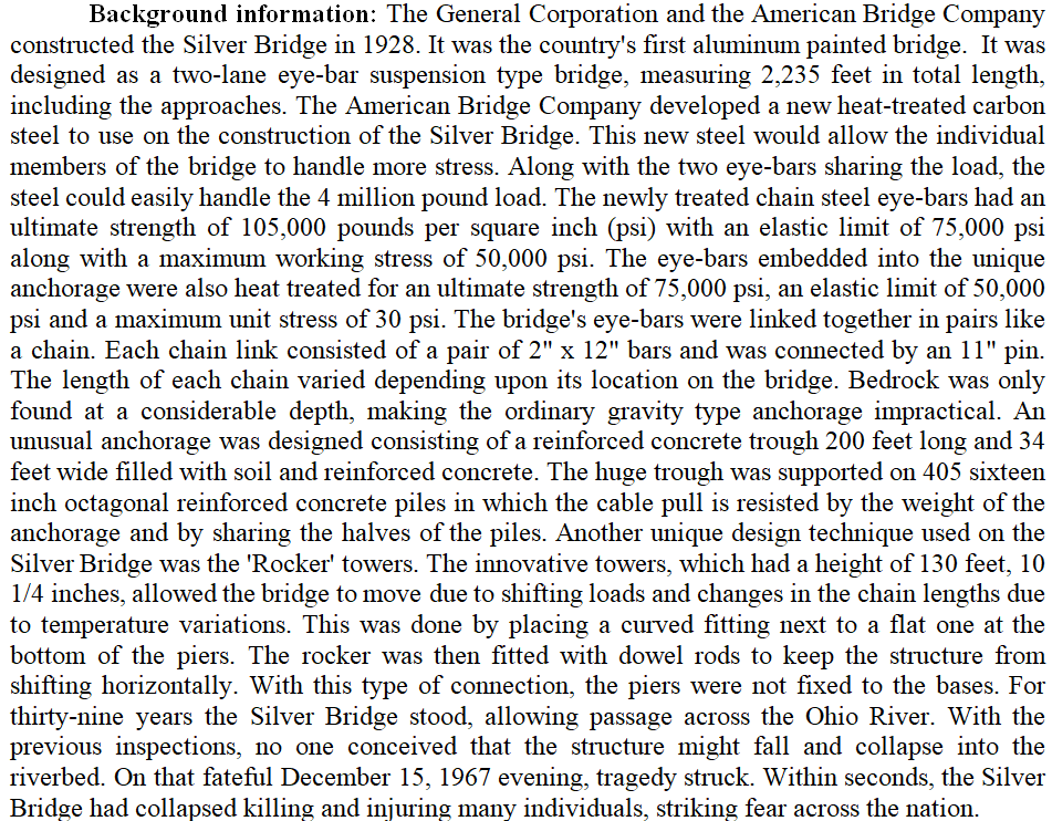 Рис. 1. Исходная информация к заданию кейс-стади для студентов инженерно-строительного профиля В данном кейсе студентам даются сведения по обрушению моста «Silver Bridge» в 1967 году в Америке, детально описывается конструкция, материалы, размеры, данные по нагрузке на мост и т.п. В процессе работы с кейсом студентам также выдаются схемы моста, демонстрируется архивная хроника разрушений. Затем студентам дается информация по причине катастрофы и предлагается в командах решить следующее задание: «Представьте, что вы перенеслись в то время, и ваша команда должна провести инспекцию мостов, которые в тот момент эксплуатировались. Подумайте, какую стратегию следует предпринять, чтобы избежать подобной катастрофы. Ваша стратегия должна включать: первичные действия в условиях случившейся катастрофы; описание квалификации и компетенций инспекторов, осматривающих другие мосты; требования к составлению отчетности; информацию о дополнительных исследованиях, которые следует провести (анализ материалов, анализ механики разрушения и т.п.)». Квазипрофессиональные задания позволяют активизировать обучающихся, научить их делегировать обязанности, работать в команде, принимать решения в условиях неопределенности и ограничения по времени, оценить свою готовность брать на себя ответственность за принимаемые решения и действия. Главным преимуществом представленного кейса и других разработанных нами квазипрофессиональных заданий выступает тот факт, что все они основаны на реальных ситуациях. Таким образом, студенты полностью погружаются в проблему и могут самостоятельно востребовать дополнительную информацию, прочитать новостные сводки, архивные статьи, посмотреть фотографии, рисунки, схемы, реальные видеорепортажи. Релевантность подобных заданий для формирования профессиональной идентичности обоснована за счет того, что работа с методами анализа ситуаций требует не воспроизведения уже готовых знаний, а необходимости понять профессиональную проблему, разобраться в ситуации, проанализировать варианты решения и возможные последствия, рассмотреть ситуацию с разных сторон. Моделируемая квазипрофессиональная деятельность сопряжена с профессиональной социализацией, совершенствованием своего профессионального мастерства, следовательно, с профессиональной идентификацией, осознанием своего профессионального «Я» в обществе и корпоративной сфере.