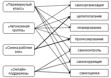 Рис. 1. Направленность моделей смешанного обучения на развитие компонентов регулятивных УУД Стрелками указаны только те связи, для которых проявление того или иного компонента регулятивных УУД является наиболее естественным и логичным. Однако, это не означает, что те или иные модели не направлены на развитие других универсальных регулятивных действий. В то же время, математика, как предметная область имеет ряд особенностей, связанных с развитием регулятивных УУД в условиях смешанного обучения. Обучение математике преимущественно строится через задачи, новый учебный материал требует обращения к предыдущему опыту, опоры на имеющиеся знания, на установления аналогий и т.п. За счет обозначенных характеристик данного учебного предмета в условиях смешанного обучения возможно говорить о целенаправленном и планомерном развитии регулятивных действий обучающихся. Самоорганизация. Модели «Перевернутый класс», «Автономная группа» сразу нацеливают обучающих на самостоятельную организацию рабочего места при изучении цифрового контента, в том числе для фиксации основных сведений, выполнения вычислений, а также указания степени поддержки при работе с пакетами математических программ. Работая в асинхронном режиме, обучающиеся сами определяют достаточное количество типовых задач. Целеполагание. Цель формулируется после того, как обучающиеся сталкиваются с проблемой, например, осознают недостаточность имеющихся знаний и умений при выполнения новых заданий (переход от уравнений определенного вида к соответствующим неравенствам, от частного вида функции к более общему, от действий с обыкновенными дробями к действиям с рациональными и т.д.). Решение такой проблемы рациональней выполнять не отдельно, а в группе, сформированной с учетом индивидуальных особенностей обучающихся, что возможно в условиях моделей «Смена рабочих зон» и «Автономная группа». Последняя из них предполагает также осуществление целеполагания без помощи учителя, т.к. небольшая часть класса выполняет задание, отличное от остальных. Планирование. Перед выполнением работы в асинхронном режиме в рамках модели «Перевернутый класс» обучающимся необходимо самостоятельно определить сроки, продолжительность, глубину, последовательность освоения учебных блоков, а «Автономная группа» также предполагает распределение обязанностей внутри группы, форму представления отчета, полноту проработки вопроса и т.д. В синхронном режиме составляется план работе всего класса на урок, а также определяется или проверяется последовательность шагов при выполнении математических заданий (алгоритм решения задачи, этапы исследования, порядок выполнения действий и т.п.). Прогнозирование. Организация группового сотрудничества в условиях моделей «Автономная группа» и «Смены рабочих зон» нередко предусматривает проведение математических компьютерных экспериментов, что подводит обучающихся к анализу различных вариантов, предвидению результатов, выдвижению гипотез. Обоснование предположение возможно при синхронном формате взаимодействия. Самоконтроль и самокоррекция. В рамках моделей «Перевернутый класс» и «Онлайн-поддержка» обучающиеся должны сами определить правильность понимания изученного материала (дома самостоятельно или в классе с учителем), выполнения и з