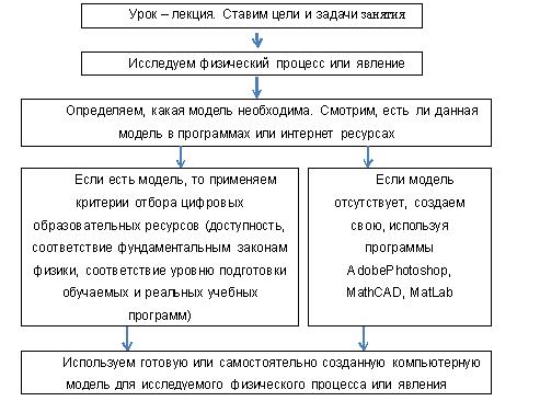 Рис.2. Линии напряженности [3] Они лишь помогают наглядно представить распределение поля в пространстве. Третья проблема заключается в «выходе в «трехмерное» пространство». Например, это актуально рассматривать в таких темах, как, Магнитостатика (сила Ампера, сила Лоренца), или при рассмотрении движение частиц в постоянном однородном поле, где траектория будет похожа на винтовую линию. Обычно наглядность, связанная с выходом в трехмерное пространство, реализуется посредством создания 3D моделей или нескольких изображений, демонстрирующих описываемый в условии задачи объект в разных проекциях. Возможности использования компьютерных моделей, созданных педагогом. В настоящее время существуют различные электронные сборники, например, «Открытая физика», «Живая физика», «Физика. Электродинамика, оптика, квантовая физика 10-11 классы для интерактивной доски» и другие, которые доступны учителю, но явно не обеспечивают всех возможностей для усиления наглядности. Современный учитель должен обладать необходимыми компетенциями, в том числе и программировать [4, 5]. Разработка профессиональных моделей недоступна педагогу, но создать простейшие модели, применяя знания, полученные в педагогическом ВУЗе можно. Например, в Российском Государственном Педагогическом Университете им. А. И. Герцена студенты факультета физики, которые обучаются по направлению 44.03.01 изучают модуль «Информационные технологии в физическом образовании», где учатся программировать с помощью программ MathCAD и MatLab. Алгоритм действия преподавателя по применению готовых и самостоятельно созданных программ может быть схематично представлен в следующем виде (таблица 1). Таблица 1 Алгоритм применения методики создания и использования компьютерных моделей в ходе урока - лекции
