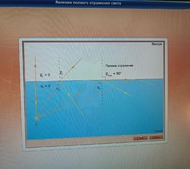 Рис. 5. Демонстрация явления полного отражения, созданного учителем в Power Point Из демонстрации видно, каким образом определяется предельный угол полного отражения. Такая анимация вполне способна заменить натурный эксперимент и способствовать лучшему пониманию учащимися явления. Заключение Решением рассмотренных проблем заключается в использовании простых средств, позволяющих получить анимационные и 3D модели для лучшего восприятия физического процесса или явления. Данный алгоритм подходит не только для проведения лекций, но и для уроков по решению физических задач. Используя данную методику, учитель связывает физические абстракции с реальностью, что приводит к повышению интереса у обучающихся и успешному освоению материала.