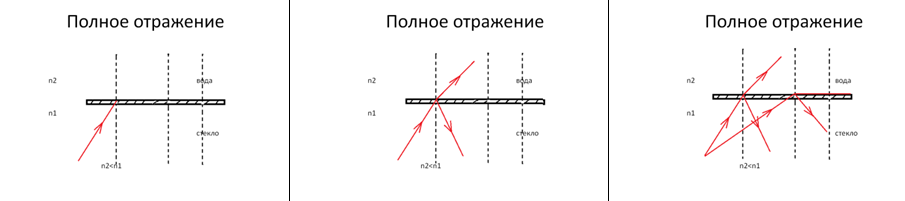 На рисунке 5 приведены последовательные изображения хода лучей при прохождении света из более плотной среды в менее плотную среду. При последовательной демонстрации изображений наглядно видно, что угол преломления γ увеличивается до значения π⁄2, после чего выходящий из плотной среды луч исчезает.
