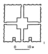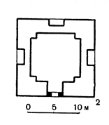 Монастырь Цыэньсы. Общий вид. План Замечательным памятником раннего китайского зодчества является Большая пагода диких гусей монастыря Цыэньсы в Чанъани, сооруженная в VII в. по проекту побывшего в Индии монаха Сюань Цзана. В настоящее время она находится в южном пригороде современного Сианя (ил. 1). Первоначально пагода имела лишь пять ярусов, но в VIII в. она была перестроена и дополнена еще двумя. Квадратная в плане пагода пирамидальной формы стоит на пятиметровой четырехугольной платформе. Ее этажи визуально разграничены карнизами, что характерно для танских павильонов. Завершением пагоды служит невысокий шатер из глазурованной черепицы. Четыре входа нижнего этажа перекрыты каменными плитами, на которых выгравированы сцены мифологического характера. Пагода отражает в своем величественном облике тот огромный подъем творческих сил, который наблюдался в начальный период династии Тан [1, c. 79].