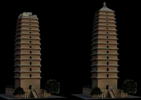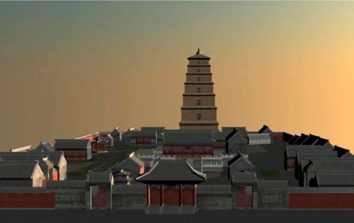династии Хань. 2018 Вслед за учеными и учебные заведения Китая включаются в процесс создания трехмерных моделей архитектурных памятников. Особенное внимание привлекают всемирно известные объекты, расположенные в Сиане, некогда бывшем Чанъанем. Речь идет, прежде всего, о пагодах диких гусей. Разрабатываемые учащимися вузов модели представляют собой реконструкцию последовательности строительства зданий, изучение строительных материалов и технологий. Особенно часто студенты стремятся воспроизвести архитектурный комплекс, который некогда существовал вокруг построек и составлял с ними гармоничное целое (ил. 4).