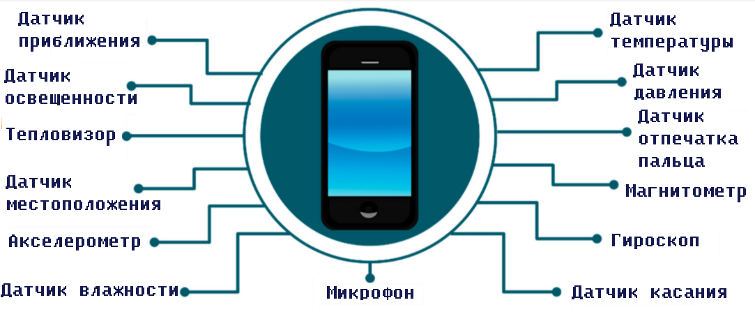 Рис. 1. Примеры физических датчиков смартфонов Для просмотра, обработки и интерпретации экспериментальных данных, полученных с помощью датчиков смартфона, существуют сотни программных приложений. Из их множества можно выделить универсальные приложения, работающие с большинством датчиков многих популярных смартфонов (например, [10,11]). При этом может оказаться, что для определенных конкретных задач лучше подойдут программы, работающие только с каким-либо одним конкретным датчиком. Приведем пример сравнительно несложной школьной лабораторной работы, которую можно провести с использованием смартфона при изучении акустических явлений. Целью работы является исследование акустического спектра звука, издаваемого плашками металлофона. Для проведения работы требуется установить на телефон соответствующее мобильное приложение. Для мобильной операционной системы «Android» подойдет приложение «Spectroid», для операционной системы «IOS» – приложение «Sonic tools». Запустим приложение и ударим молоточком по плашке металлофона. На экране отображения спектрограммы будут видны несколько отчетливых пиков. Пик с наименьшей частотой будет отвечать основному тону звука, частоты остальных пиков – обертонам. Измерим частоты основных тонов колебаний плашек. Каждая плашка