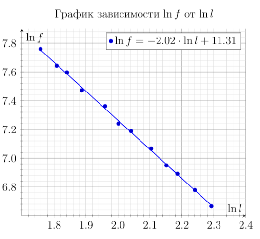 с учетом погрешности принимает два разных значения: С физической точки зрения звук, издаваемый плашками металлофона, является следствием колебаний плашки. Интересно исследовать, как зависит частота колебаний плашки от ее длины. Для этого измерим длины всех плашек и построим график зависимости частоты f колебаний основного тона от длины l плашки в двойном логарифмическом масштабе (рис. 2). Видно, что график хорошо описывается линейной функцией с угловым коэффициентом, равным –2. Полученный результат соответствует теоретической зависимости частоты изгибных колебаний планки от ее длины [13]. Следует отметить, что планка закреплена в узловых точках пластинки, совершающей такие колебания.