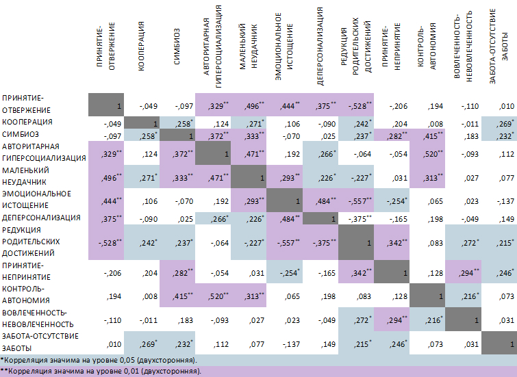 Abstract Key words: parental involvement, parent-child relationship, parental burnout. ---------------- Взаимодействие образовательных учреждений с родителями становится в последнее время важным предметом исследования, см., например [1, 2]. По мнению учителей и работников администрации образовательных учреждений, многие родители слабо интересуются жизнью ребенка, перекладывая ответственность за результат обучения и воспитания на образовательные учреждения. В России и за рубежом активно изучается тема родительской вовлеченности в процесс образования ребенка [3 - 5]. Под родительской вовлеченностью понимается участие родителей в академическом развитии и образовании детей, родительские образовательные практики, убеждения относительно образовательных возможностей ребенка и мотивационные установки относительно образования [5]. Задача настоящего исследования состояла в проверке предположения, что стиль детско-родительских отношений может определять степень и особенности родительской вовлеченности. В рамках исследовании были изучены психологические характеристики родителей (дети которых посещают учреждения дополнительного образования) с разной степенью родительской вовлеченности. В исследовании приняли участие 87 человек (84 женщины и трое мужчин) - родители детей, посещающих Дворец детского (юношеского) творчества (ДД(Ю)Т) Московского района Санкт-Петербурга. Возраст детей испытуемых находился в границах 5-15 лет. Для оценки степени вовлеченности был использован опросник «Функциональное содержание родительства и родительская вовлеченность» в модификации Сомовой Н.Л. Опросник позволяет выявить вовлеченность родителя, контроль над жизнью ребенка, уровень заботы и принятия. Для выявления психологических характеристик и особенностей детско-родительских отношений был применен опросник родительского отношения В.В.Столина, А.Я.Варга [6]. Исследуемые методикой референты: «Принятие — отвержение», «Кооперация», «Симбиоз», «Авторитарная гиперсоциализация», «Маленький неудачник». Дополнительно для уточнения эмоционального состояния родителей использовалась методика «Родительское выгорание» Ефимова И. Н. [7]. Данная методика позволяет определить наличие родительского выгорания, а также выявить степень выраженности его специфических симптомов. В качестве методов обработки данных использовались методы первичной статистики, корреляционный анализ, кластерный анализ. По результатам психологического опроса респондентов была получена база данных по 13-ти шкалам, в рамках которой для выявления взаимосвязей был проведен корреляционный анализ, см. рис1.