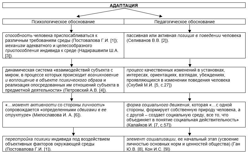 Поэтому мы будем рассматривать процесс адаптации субъекта как сложный, многофакторный процесс, носящий динамический характер, с целью выстраивания оптимального взаимодействия между средой и субъектом. В целом, мы согласны с Г.А. Гусевым [10], который выделяет три состояния адаптации: биологическое, психологическое и социальное, управляемое двумя программами – генетическим кодом субъекта и социально-культурными нормами и установками. В психолого-педагогической литературе встречаются два подхода к раскрытию понятия «адаптация»: