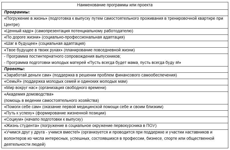 При подготовке к выпуску специалисты Центра ПВ и ПС проводят работу просветительского характера и знакомят воспитанников 9-11 классов с учреждениями органов исполнительной власти, органов местного самоуправления, органов внутренних дел, прокуратуры, учреждениями здравоохранения, культуры, учреждениями жилищно-коммунального хозяйства, аптеками и др. Организуются экскурсии в эти учреждения, встречи со специалистами, беседы с руководителями и т.п. Каждому выпускнику вручается брошюра с информацией, какую помощь в каких учреждениях он может получить, какими льготами и правами он может пользоваться, по каким телефонам может обратиться за помощью или консультацией, другой полезной и необходимой информацией. Сотрудники Центра ПВ и ПС разработали и реализуют в форме занятий и индивидуальных консультаций программы и проекты, сопутствующие социальной адаптации молодых людей, выпустившихся из Детского дома. Результативность данной программы высока потому, что работа выстроена точечно, индивидуально под каждого воспитанника (таблица 2). Таблица 2 Программы и проекты, реализуемые Центром ПВ и ПС