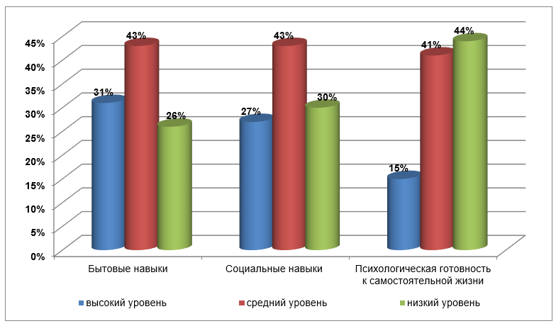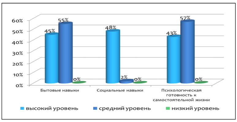 Рис. 3. Уровни социальной адаптации участников программы по итогам реализации программы «Погружение в жизнь» Участники программы в большинстве своем сегодня имеют множество социальных контактов, занимают активную позицию в жизни и профессиональном образовательном учреждении, принимая участие в различных мероприятиях. В программе выпускники расширили знания социально-бытового характера, значительно повысили уровень психологической готовности к самостоятельной жизни. Дальнейший личностный рост и активность выпускников будут зависеть от их целей, желаний и намерений. Заключение Вопросы социальной адаптации и устройства в жизни выпускников сиротских учреждений сегодня остро стоят перед российской наукой. Есть много практических наработок, удачного опыта работы отдельных учреждений для сирот по социальной адаптации их выпускников, однако весь этот материал необходимо осмыслить, теоретически обосновать и обобщить в методических рекомендациях для сиротских учреждений.
