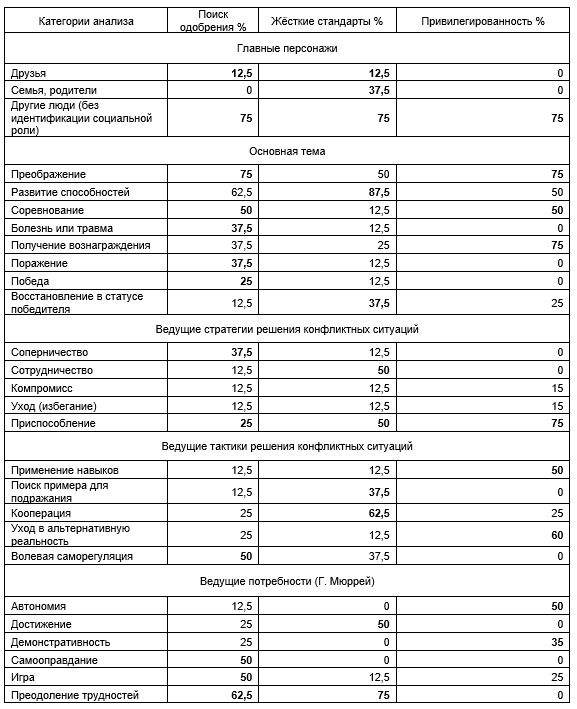Из приведенной таблицы видно, что в зависимости от выраженности разных дезадаптивных схем изменяется и содержательное наполнение автобиографических воспоминаний. Анализ социальных взаимодействий показывает наличие коммуникации с широким социальным кругом и отсутствие близких социальных связей в рамках спортивной карьеры. В большинстве воспоминаний у всех групп чаще всего присутствуют неидентифицированные Другие (цит. «всем девочкам ставили 5 за новые элементы»; «я попала в группу своих ровесников и сильно обгоняла остальных»). Семья чаще появляется в рассказах спортсменов с выраженными жесткими стандартами (цит. «В спорт меня привела мама в 3 года, я была самый младшей в группе, остальным было 8 лет») и задает модель поведения, которая является основой данной дезадаптивной стратегии. Друзья упоминаются в рассказах у спортсменов с поиском одобрения и выраженными жесткими стандартами, но больше в обезличенном виде: цит. «Я очень быстро привыкла и к новому тренеру и к девочкам, все были очень добрые и мы быстро подружились». Фигура тренера остается также обезличенной (цит. «Начались совершенно другие нагрузки, новый коллектив, новые тренеры») и упоминается в функциональном ключе. Анализ основных тем показал, что для респондентов со схемой поиска одобрения наиболее присущи темы преображения, развития способностей, соревнования, болезней и поражения (цит. «В сборной я потренировалась, полгода и попала в больницу с тяжелым заболеванием от переутомления. Когда я лежала в больнице, я не понимала всю серьезность моего состояния и даже пару раз пыталась сбежать и пойти в зал, потому что очень боялась, что меня отчислят»). В группе спортсменов с выраженными жесткими стандартами в большей степени представлены темы развития способностей и восстановления в статусе (цит. «У меня в плече оторвалась мышца, до чемпионата России оставался один месяц. Я подумала, ну ничего страшного дотренируюсь один месяц, у меня же всё-таки не рука оторвалась, а всего лишь мышца»). В группе с выраженной схемой привилегированности в большей степени представлены темы преображения, соревнования и получения вознаграждения (цит. «каждую тренировку, я начинала свою программу где-то в углу, а заканчивала всегда перед тренером. Я должна была оказаться там, чтобы на меня обратили внимание»). Анализ ведущих стратегий решения конфликтных ситуаций и потребностей показал, что в основном все группы используют стратегию приспособления. Сотрудничество, кооперация, поиск примера для подражания в большей степени выражены у спортсменов со схемой «жесткие стандарты», что в соотношении с потребностью в достижении и преодолении трудностей описывает основную стратегию поведения. Соперничество, волевая саморегуляция, потребность в самооправдании, игре и преодолении трудностей представлены в группе спортсменов со схемой «поиск одобрения». В группе со схемой «привилегированность» выражена тактика приспособления, применения навыков, уход в альтернативную реальность, поиск автономии и потребность в демонстративности. В заключении хочется сказать, что автобиография спортсменов являются богатым источником информации о трудностях и жизненных уроках людей, добившихся успехов в мире спорта. Данный опыт показывает, как формируются базовые убеждения и способы преодол