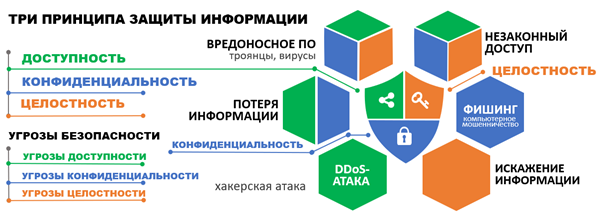 Рис. 1. Фрагмент инфографики на тему «Общие вопросы обеспечения кибербезопасности» Необходимо понимать, что инфографика – это средство визуализации, дополнительный вспомогательный инструмент преподавателя в объяснении содержания учебного занятия. На наш взгляд, инфографика сама по себе не должна полностью «объяснять» содержимое темы учебного занятия. Инфографика становится понятной, когда преподаватель прокомментирует, объяснит и озвучит ее содержание. На сегодняшний день существуют различные инструменты для создания инфографики – от стандартных прикладных программ в составе офисных пакетов до профессиональных редакторов компьютерной графики. Авторы [3] отмечают, что разработчикам инфографики необходимо иметь «знания в области эстетики, художественного образа, сочетаемости формы и цвета» [3, с. 157], уметь работать со специальным программным обеспечением, графическими редакторами. На наш взгляд, педагогу целесообразно освоить программы для подготовки компьютерных презентаций, например Microsoft PowerPoint или LibreOffice Impress. Эти программы содержат необходимые инструменты (смарт объекты), которые представляют собой «заготовки» для создания инфографики. Как правило, преподаватели имеют опыт разработки презентаций (слайдов) к учебным занятиям и освоение дополнительных возможностей программы не вызывает затруднений. Вместе с тем, создание инфографики требует значительных затрат времени, ее невозможно в полной мере выполнить, используя готовые шаблоны. Неудачное сочетание визуальных средств может отвлечь внимание обучающихся от изучаемой темы, запутать, затруднить понимание учебного материала. Инфографика будет неэффективна, если «отражаемые данные в графических элементах нелогично выстроены и не упорядочивают заложенный в них смысл» [3, с. 157]. Нелишне подчеркнуть, что на учебном занятии с использованием инфографики необходимо не только грамотно распределить аудиторное время на узловые вопросы темы, систематично и последовательно выстроить ход занятия, но и предусмотреть определенную долю самостоятельной работы обучающегося. Мы считаем наиболее эффективными следующие приемы самостоятельной работы с инфографикой: выделить основные понятия темы учебного занятия, дать определение выделенным понятиям; сформулировать основные тезисы, кратко излагающие суть учебного материала по теме занятия; предложить свой опорный сигнал (условный знак, символ, рисунок) для ключевых понятий. Грамотно разработанная инфографика помогает обучающимся освоить наиболее сложные учебные вопросы, формирует целостную систему знаний об изучаемом объекте. Использование инфографики на учебных занятиях развивает навыки самостоятельной работы обучающихся, способствует проявлению активной творческой и созидательной деятельности.