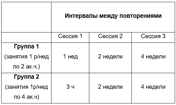 Abstract Key words: space repetition method, repetition, learning a foreign language, lexical aspect, vocabulary, non-linguistic specialties. ---------------- Так называемый эффект интервального повторения давно известен в психолого-педагогической науке как эффективный инструмент для улучшения запоминания фактов и освоения навыков, который, в том числе, используется и в преподавании иностранных языков. Суть эффекта заключается в том, что, согласно закономерностям, открытым Г. Эббингаузом [1], повторение заучиваемой информации через определенные интервалы дает более эффективные результаты, чем концентрированное, или интенсивное, научение. Применительно к иностранным языкам данное открытие пользуется особенной популярностью при разработке методик для запоминания иноязычной лексики. В то же время, большинство описанных в литературе примеров использования интервального повторения при обучении иностранным языкам [2-4] осуществлялись в лабораторных условиях, а не в условиях реального педагогического процесса. Настоящая работа имела целью проведение педагогического эксперимента по освоению студентами англоязычной общенаучной лексики с применением эффекта интервального повторения и сопоставление результатов с полученными ранее [5] по запоминанию и закреплению грамматического материала. Для изучения иностранных языков интервальный эффект начали применять еще с первой половины XX века. Было показано, что в отличие от освоения других практических умений, усвоение лингвистического материала имеет некоторые характерные особенности. Основной такой особенностью является тот факт, что при первичном тесте концентрированные и интервальные группы в большинстве случаев показывают приблизительно одинаковые результаты, в некоторых случаях - несколько более высокие в интенсивных, чем в интервальных; положительный эффект интервального подхода становится заметным только при отсроченных тестах. Например, в работе [2] описываются результаты обучения школьников, которые учили определенный набор французских слов в течение одного либо трех дней. Результаты первичного теста были в среднем одинаковыми, однако при отсроченной проверке через четыре дня лучшие результаты показала вторая, интервальная группа. Еще одно исследования применения интервального повторения при изучении ИЯ описывается в работе [4], где описывается эксперимент по изучению взрослыми англоговорящими студентами слов на языке суахили с широким варьированием интервала повторения - от 20 минут до нескольких суток (в условиях, когда интервал между последней сессией и отсроченным финальным тестом также составлял порядка нескольких суток). В основе исследования лежало предположение о том, что при значительном промежутке времени между последней сессией и итоговой проверкой более эффективными будут более длительные интервалы, в то время как при проведении теста непосредственно после повторения более благотворным окажется концентрированное научение. В ходе эксперимента студенты запоминали 40 слов на незнакомом для них языке (суахили) в течение двух сессий, интервал между которыми составлял 5 мин, сутки, 2, 4 и 7 суток. При итоговой проверке, осуществлявшейся еще через 10 суток была выявлена нелинейная зависимость процента правильно воспроизведенных слов от временного интервала: самые низкие результаты наблюдались для 5-минутной г