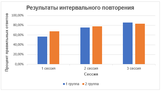 По результатам первой из сессий на повторение у обеих групп, как и можно было ожидать исходя из кривой забывания Эббингауза, более высокие показатели имела вторая группа (с интервалом 3 часа, т.е. с более интенсивным научением, чем первая группа), набравшая в среднем 67,57% правильных ответов, по сравнению с 1 группой (первая сессия через 1 неделю), средний балл в которой составлял только 57,14% правильных ответов. На второй сессии обе группы продемонстрировали более высокие результаты, чем во время первой, и по-прежнему первое место занимала интенсивная группа, однако интересно отметить, что разрыв значительно сократился - 77 и 76% правильных ответов у интенсивной и интервальной группы, соответственно. Подобные закономерности были получены также при эксперименте на запоминание грамматического материала, описанного в работе [5]. Во время же итоговой, третьей, сессии, динамика несколько изменилась: показатели обеих групп снова возросли, но более высокие результаты продемонстрировала первая группа (с большим, недельным интервалом): 85% и 83% правильных ответов для 1-ой и 2-ой групп, соответственно. Данный результат согласуется с исследованием [3], где также описан больший прирост показателей у группы с более длительным первичным интервалом при более низких результатах на первой сессии.