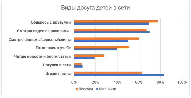 Рис. 1. Интернет–активность ребенка в зависимости от пола Специалисты связывают формирование «компьютерной игровой зависимости» с различными факторами, включая индивидуальные особенности пользователя, и рассматривают это формирование как поэтапный процесс, включающий в себя [9]: