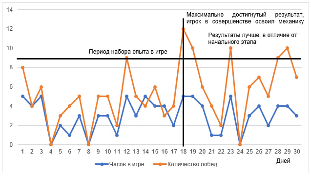 Рис. 3. Игровая статистика произвольного (тип геймера 2) игрока Следующий этап соответствует «стадии увлеченности» ребенка компьютерной игрой. На основании графика (рис. 3) можно сделать следующие выводы: