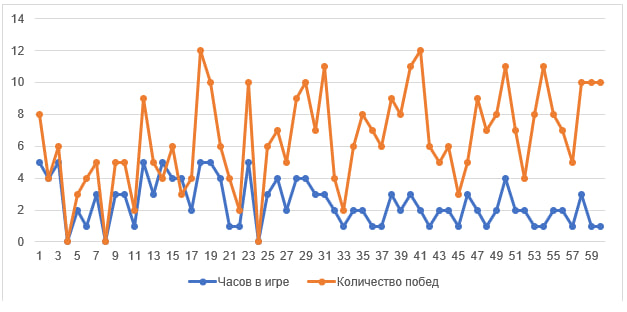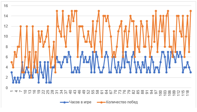 Рис. 4. Игровая статистика произвольного (тип геймера 3) игрока Из графика на рис. 4 видно, что количество побед у данных игроков выше, чем у других - 9,89 (максимально 15 побед за 1 сеанс игры), количество часов 3,48 сопоставимо с результатом у двух предыдущих типов игроков. Прослеживается тенденция стагнации в области разработки новых стратегических планов и приемов, для установления новых рекордных значений. Можно предположить, что данные игроки (тип геймера 3) просто соревнуются между собой, что является недопустимым результатом игровой деятельности: дети не развиваются в процессе подобных игровых соревнований. Они играют в игру на уровне агрессивного эмоционального фона, мечтают добиться признания со стороны игрового сообщества данного проекта. Они стремятся к наивысшему результату путем более продолжительной игры. Можно заключить, что дети, которые уделяют такое количество времени данной игре находятся на «стадии привыкания», переходящей в дальнейшем, возможно в «стадию зависимости». Эти выводы, полученные на основе игровой статистики, свидетельствуют о необходимости проведения психолого – педагогической экспертизы детей и последующей коррекции их состояния. Однако, поскольку данные были анонимны, нивелировать негативный эффект в рамках исследования не предоставлялось возможным. Проведенное исследование позволяет заключить, что для того чтобы познавательное развитие ребенка проходило благополучно, количество времени, проводимого ребенком дошкольного возраста за компьютером, и содержание компьютерных игр должны регулироваться. Можно обозначить и причины, препятствующие такому регулированию: