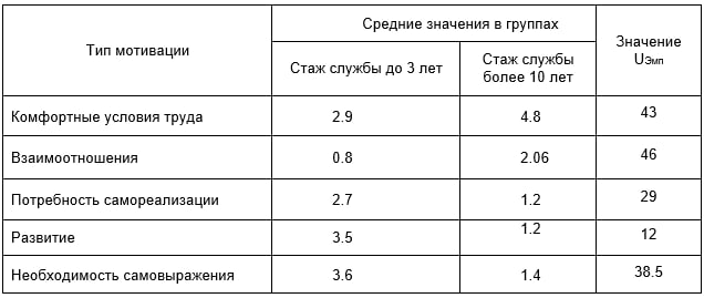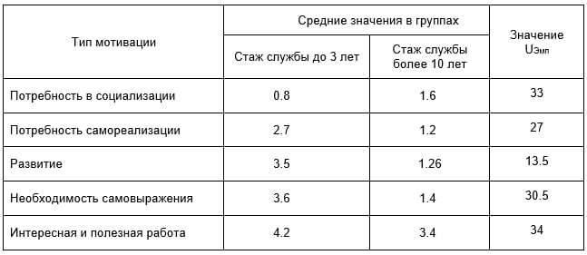 Данные показывают, что у изученных групп сотрудников существуют специфические особенности мотивации профессиональной деятельности. Для молодых сотрудников отдела охраны более характерна ориентация на профессиональные достижения, самореализацию, а для сотрудников со стажем службы более 10 лет свойственны ориентация на социальное взаимодействие, полезность работы и ее интересность. В Таблице 2 представлены средние значения шкал по методике мотивационного профиля личности у сотрудников отдела безопасности. Таблица 2 Сравнение значений шкал по методике мотивационного профиля личности (отдел безопасности)