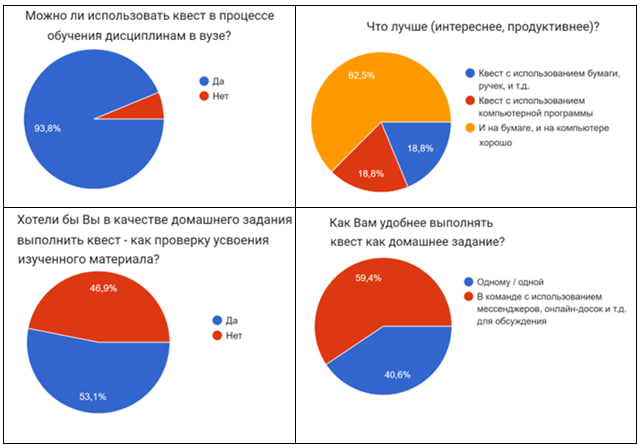 Предвидя, что обучающимся неизвестно о существовании квеста в качестве современной образовательной технологии мы задали им вопрос о возможности использования квеста в процессе обучения дисциплинам в вузе. В преддверии разработки образовательного квеста авторам было важно не только выявить желание студентов выполнять учебные задания посредством квеста, но и учесть их предыдущий опыт. Так, были определены остальные вопросы анкеты, ответы на которые представлены на диаграммах рис. 1.