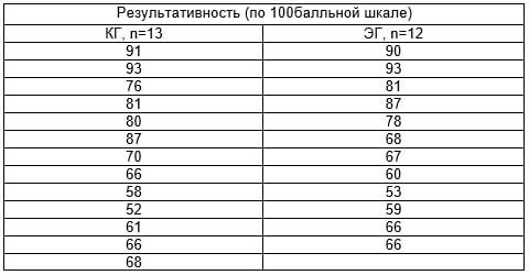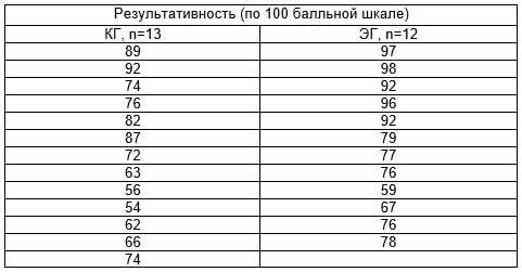 Рис. 1. Результат сравнения результативности КГ и ЭГ на констатирующем этапе педагогического эксперимента с помощью теста Манна-Уитни Поскольку асимптотическое двустороннее p-значение 0,891545 > 0,05, мы не можем отвергнуть нулевую гипотезу. Таким образом на 5% уровне статистической значимости принимается гипотеза об однородности КГ и ЭГ. В рамках формирующего этапа экспериментальной части исследования осуществлялась реализация учебного процесса в обеих группах студентов. По окончанию формирующего этапа были осуществлены повторные измерения, фиксируемые в протоколах преподавателями и представлены в таблице 2. Таблица 2 Результаты освоения дисциплины математический анализ на контрольном этапе педагогического эксперимента