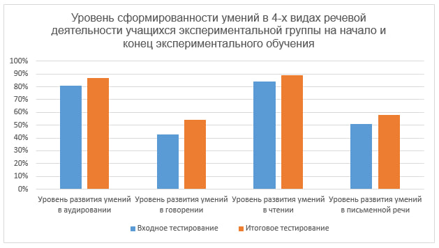 Экспериментальное обучение проходимо на базе школы № 639 с углубленным изучением иностранных языков (Невский р-н Санкт-Петербурга). На первом занятии в экспериментальной и контрольной группах было проведено входное тестирование. Далее в экспериментальной группе было организовано обучение, включавшее в себя выполнение заданий, разработанных на основе технологии иноязычного коммуникативного тренинга. Обучение в контрольной группе проходило в соответствии со школьной программой без изменений. На последнем занятии в обеих группах было проведено итоговое тестирование. Входное и итоговое тестирования были идентичны по своей структуре и подразумевали собой выполнение 2-х заданий, каждое из которых, в свою очередь, имело разделение на две части согласно виду речевой деятельности (чтению, аудированию, говорению и письму). Для оценки уровня сформированности речевой компетенции учащихся были разработаны критерии оценивания иноязычных речевых умений (К1 – К8), по которым были оценены ответы учащихся на входном и итоговом тестированиях. К1 – коэффициент извлечения информации, необходимой для решения коммуникативной задачи, К2 – коэффициент прогнозирования, К3 – коэффициент умения использовать полученную информацию в других видах речевой деятельности, К4 – коэффициент использования лексико-грамматических структур в речевых высказываниях, К5 – коэффициент использования устойчивых выражений и клише, К6 – коэффициент соблюдения последовательности и логики изложения, К7 - коэффициент аргументации высказывания, К8 – коэффициент соблюдения установленного объёма высказывания. В ходе экспериментальной проверки разработанного комплекса упражнений было выявлено повышение уровня сформированности речевой компетенции в экспериментальной группе. Наглядно динамика уровня развития умений речевой компетенции по четырём видам речевой деятельности в экспериментальной группе представлена на следующей диаграмме 1: Диаграмма 1 Динамика уровня развития коммуникативных умений