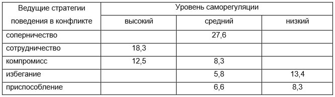 Оценка достоверности различий с помощью U-критерия Манна-Уитни показала, что значение средних показателей общего уровня саморегуляции отличаются значимо между всеми группами (U= 0при p≤0,01). Сопоставление данных, полученных при изучении стратегий поведения в конфликте и общего уровня саморегуляции, показывает, что в данной группе подростков представлен весь спектр стратегий поведения в конфликте (соперничество, сотрудничество, компромисс, избегание, приспособление). При этом, подростки, предпочитающие стиль поведения соперничество (26,7%), характеризуются средним уровнем саморегуляции; подростки, у которых доминирует стиль сотрудничество (18,3%), показали высокий уровень саморегуляции; подростки, с доминирующем стилем компромисс (20,8%), отличаются высоким и средним уровнями саморегуляции; подростки, выбирающие избегание (19,2%), показали средний и низкий уровни саморегуляции; у подростков с доминированием стиля приспособление (15%) выявлен средний и низкий уровень саморегуляции (табл. 1). Таблица 1 Результаты исследования ведущих стратегий поведения в конфликте и уровней саморегуляции старших подростков (в %)