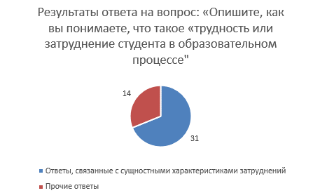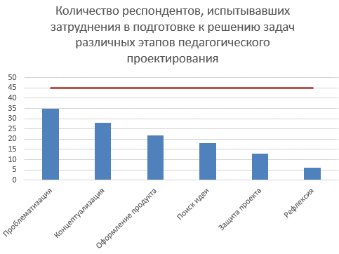 Затруднения обучающихся в подготовке к педагогическому проектированию есть их субъективное состояние неопределенности относительно этого процесса и его результата [5, 6]. Эти затруднения носят объективно-субъективный характер. Объективный характер определяется особенностями этой деятельности, в субъективный – степенью понимания, осмысления эти затруднений, что невозможно без соответствующей активности обучающихся. Исследование затруднений обучающихся в процессе их подготовки к педагогическому проектированию проводилось на базе магистратуры института педагогики РГПУ им. А.И. Герцена. Количество участников исследования – 45 человек. Выборка представляла собой магистрантов до момента прохождения специального курса по изучению педагогического проектирования. В соответствии с разработанном нами методикой выявлялись суждения обучающихся: