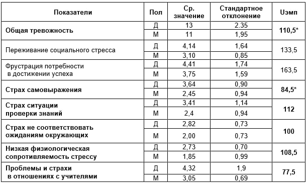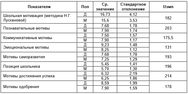 В ходе сравнительного анализа при помощи критерия Манна Уитни были обнаружены значимые различия в группах мальчиков и девочек по показателям «общая тревожность», «страха самовыражения», «страха ситуации проверки знаний», «страх не соответствовать ожиданиям окружающих», «низкой физиологической сопротивляемости стрессу» и по показателю «проблемы и страхи в отношениях с учителями». Как оказалось, девочки более склонны к ощущению тревожности и стресса, поскольку было выявлено 9% с высоким уровнем тревожности и 53% с повышенным уровнем тревожности и лишь 38% оказались с умеренной тревожностью. В группе мальчиков уровень тревожности, относящийся к зоне высоких значений не был обнаружен, а у 74% респондентов было выявлено повышенный уровень и 26% умеренный. Таким образом, существуют различия в восприятии ситуаций по-разному мальчиками и девочками, их стрессоустойчивости, а также способах реагирования на стрессовые ситуации. Для мужской половины класса наибольшую тревожность вызывает страх самовыражения и страх ситуации проверки знаний, тогда как в группе девочек добавляется общая тревожность и проблемы и страхи в отношениях с учителями. Результаты исследования учебной мотивации в группах мальчиков и девочек, представлены в таблице 2. Таблица 2 Результаты сравнительного анализа учебной мотивации в группах мальчиков и девочек