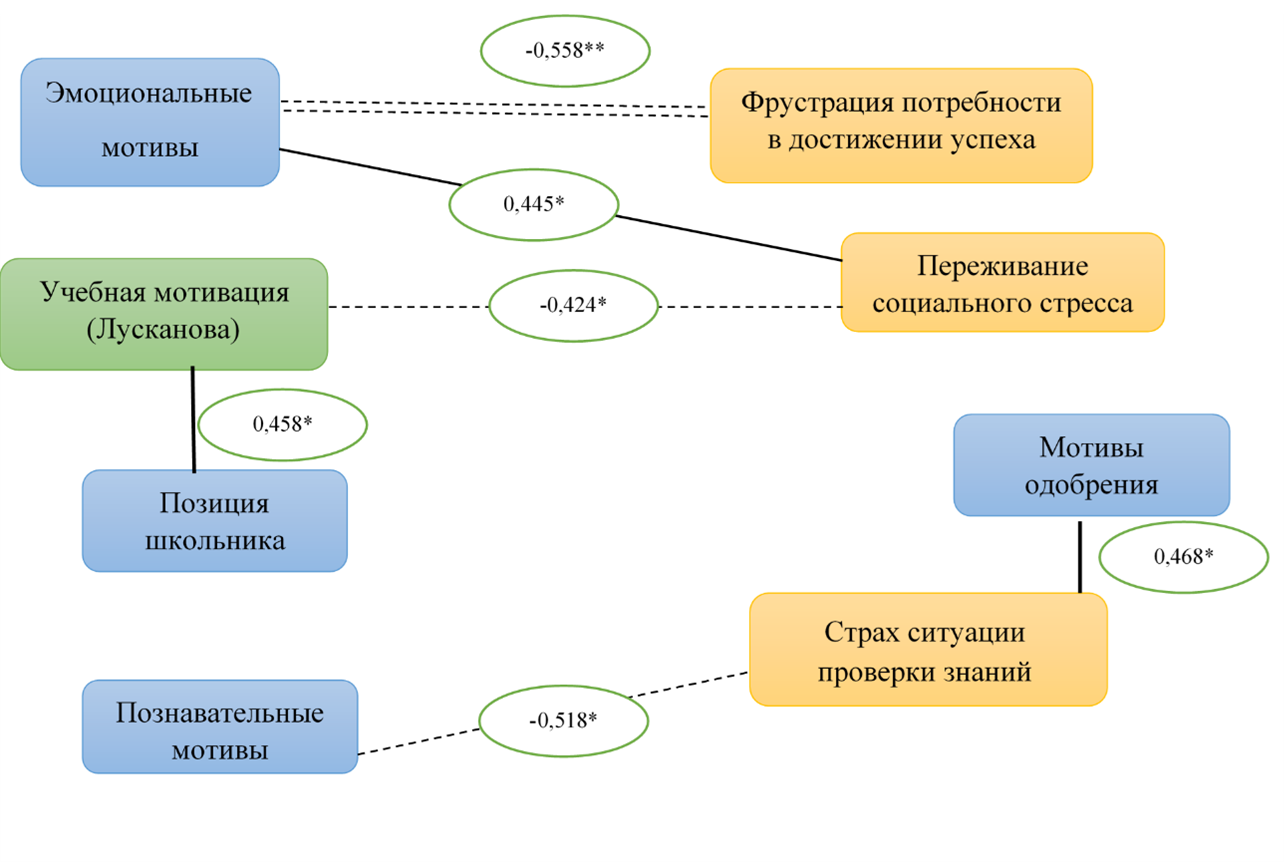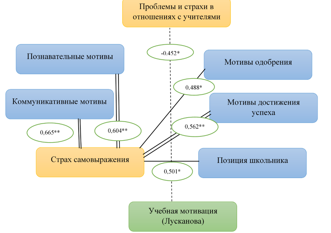 Рис. 2. Корреляционная плеяда взаимосвязей уровня тревожности и учебной мотивации в группе мальчиков Анализируя полученные результаты, видно, что в группе мальчиков наблюдается единственная отрицательная корреляционная связь между учебной мотивацией и проблемами и страхами в отношениях с учителями. Такие ученики – инициативны, проявляют большой интерес к процессу обучения, более расположены к общению с учителями. Что свидетельствует о том, что у подростков с высоким уровнем мотивации гораздо меньше возникает сложностей с учителями, нежели чем у подростков с низким уровнем учебной мотивации. Высокие положительные взаимосвязи были выявлены на уровне p ≤ 0,01 между шкалой «страх самовыражения» и со шкалами «познавательные мотивы», «эмоциональные мотивы», «мотивы достижения успеха». Подросток может испытывает беспокойство, тревогу или неудобство при выражении своих мыслей, чувств или идей. Ученики с высоким уровнем страха самовыражения могут чувствовать неуверенность в своих способностях, опасаться негативной реакции окружающих, бояться быть осужденными или оцененными негативно за свои высказывания. Преодоление барьеров, мешающих выражать себя, часто требует укрепления уверенности в себе, развитием навыков коммуникации, практикой выступлений и постепенного расширения привычной зоны комфорта. Поэтому логично, что эмоциональные и познавательные мотивы, мотивы достижения успеха повышаются с повышением уровня страха самовыражения. Также положительные взаимосвязи были выявлены на уровне p ≤ 0,05 между шкалой «страх самовыражения» и шкалами «позиция школьника» и «мотивы одобрения». В таком случае мотивация может зависеть от желания получить одобрение со стороны других людей. Мальчики более склонны к совершению шагов и принятию решений на основании того, как их действия будут восприниматься окружением, а не на основе своих собственных предпочтений и желаний. Таким образом, исследование показало, что уровень тревожности в группе девочек выше, чем в группе мальчиков. Учебная мотивация в двух группах имеет средний уровень и соответствует нормативности в этот период развития. Структура взаимосвязей уровня тревожности и учебной мотивации выявили специфику характерную для групп мальчиков и девочек. Так для девочек характерна эмоциональная составляющая мотивации, и она тесно связана с восприятием своих успехов и или неудач в учебном процессе. В группе мальчиков был выявлен более сложный характер взаимосвязей между эмоциями, мотивами и социальными аспектами в процессе учебной деятельности. Кроме того, психологическое восприятие и тип реакции на ситуацию проверки знаний существенно разнятся между мальчиками и девочками.