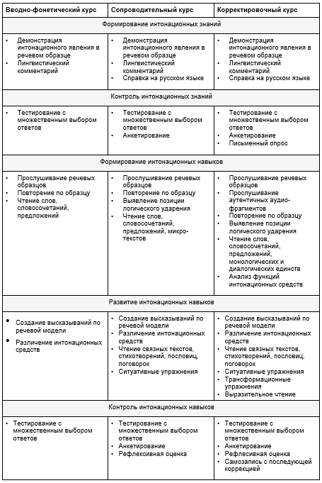 Можно отметить, что все задания, характерные для начального этапа обучения, сохраняются и в последующих курсах. Главное отличие обучения интонации на уровнях B2-C1 заключается в характеристике используемого языкового материала. Сопроводительный курс представляет собой связующее звено между строго организованным вводно-фонетическим и более свободным, творческим корректировочным курсами. Таким образом, каждому этапу обучения соответствует определенный комплекс интонационных единиц и средств обучения, применяемых в иностранной аудитории. Планомерное развитие навыков интонационного оформления способствует становлению нормативной и выразительной русской речи иностранных учащихся.