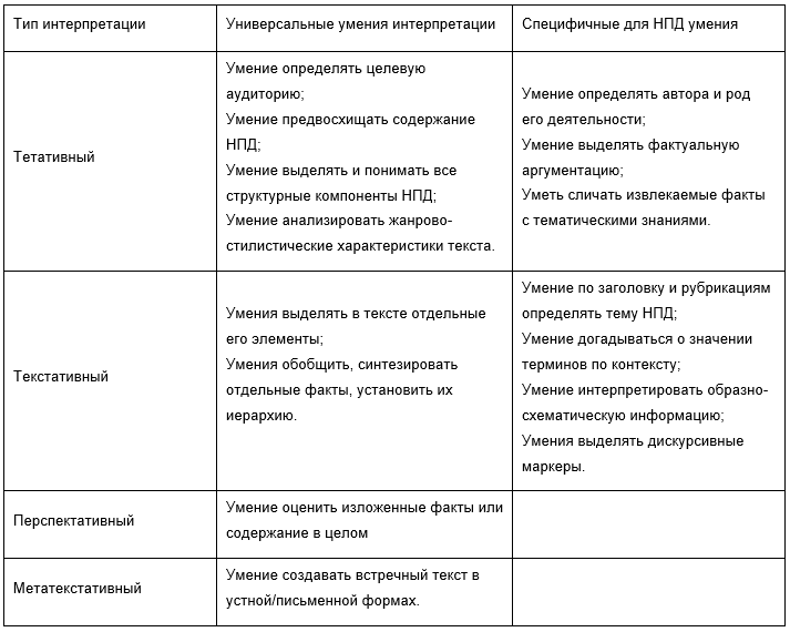 Одним из видов анализа дискурса является интерпретация, имеющая широкий потенциал при работе с НПД в старшей профильной школе, вследствие описанных лингвистических и стилистических особенностей. Интерпретация является частью текстовой деятельности, предметом которой является текст, объектом – содержание и смысл текста, целью – критическое изучение смысла текста, результатом – адекватное представление о фрагменте действительности, представляемого текстом. В рамках данного исследования под интерпретацией научно-популярного дискурса, вслед за Г. Л. Тульчинским, мы понимаем когнитивно-коммуникативную деятельность, направленную на смысловое восприятие содержания и продуцирование собственного текста, выступающего результатом освоения смыслового наполнения НПД [7]. Совершенствование умений интерпретации является одной из ключевых задач обучения, что подтверждает анализ нормативных документов. Под умениями интерпретации НПД мы понимаем способность обучающихся осуществлять действия, направленные, с одной стороны, на смысловое восприятие содержащейся в НПД имплицитной и эксплицитной информации, с другой стороны, на отражение в интерпретируемом высказывании как результате когнитивно-коммуникативной деятельности логической процедуры подтверждения, выраженной в устной или письменной форме. Так как интерпретация (интерпретационная деятельность) является компонентом текстовой деятельностью, при её совершенствовании подразумевается не только ознакомление с текстом и его осмысление, но и продуцирование собственного текста, что имеет особое методическое значение, поскольку продуктом интерпретации является встречный текст [7]. Исходя из приведенного анализа интерпретации как части текстовой деятельности и особенностей научно-популярного дискурса, мы выделили умения интерпретации в соответствии с её типами (см. Таблицу 1). Таблица 1 Номенклатура умений интерпретации научно-популярного дискурса