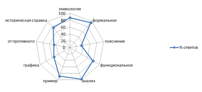 Данные типы дефиниций, выделенные на материале англоязычных словарных и научных статей, выстроенные в предложенную выше последовательность, предлагают начинающему исследователю полезную модель по определению ключевых понятий своего исследования. Последовательно и вдумчиво раскрывая каждый тип дефиниции, магистрант приходит к полному и исчерпывающему пониманию исследуемого явления. Следует отметить, что далеко не все словарные статьи пользуются всеми типами дефиниций. Иногда это обусловлено форматом словаря, а иногда предпочтениями автора словарной статьи. На материале анализа словарных дефиниций гуманитарных терминов был проведен опрос 100 выбранных магистрантов (экспериментальная группа), задачей которых было оценить значимость различных типов дефиниций для понимания смысла и сути изучаемых явлений и понятий (рис.1).