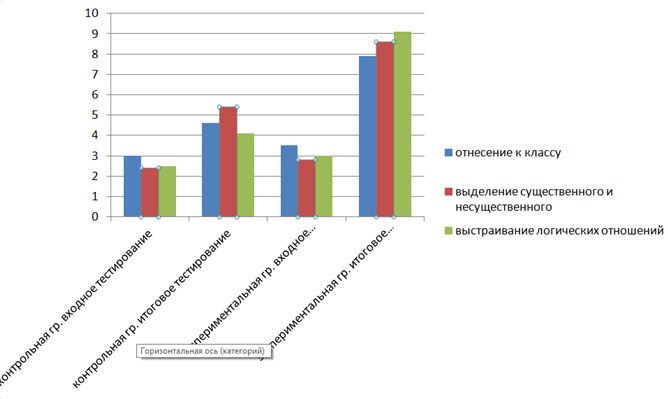 Рис. 1. Значимость различных типов дефиниций, по мнению студентов Было установлено, что наибольшее значение, по мнению молодых исследователей, имеют: этимология, формальное определение, анализ и примеры. Чуть меньшее значение они придают функциональным определениям и исторической справке. И еще меньшую роль отводят пояснению, графике и определению «от противного». Последняя группа определений считается наименее значимой, видимо, потому, что пояснения не всегда необходимы, графические средства не всегда можно использовать при описании гуманитарных концептов, а определение «от противного» часто бывает излишним для понимания. Эксперимент показал также, что тренировка мышления магистрантов по предложенной модели не только позволяет им решить профессиональную задачу – корректно определить свои термины для последующего использования, но и существенно развивает такие навыки, как: выделять существенное и несущественное, относить к классу, выстраивать логические отношения, а также создавать собственный оригинальный интеллектуальный продукт – рабочее определение – и аргументировать свою точку зрения. При сравнении экспериментальной группы, целенаправленно обучавшейся строить дефиниции по данной модели, и контрольной группы, которой данное задание было предложено только в качестве входного и итогового теста, можно заметить существенный прирост вышеупомянутых навыков у экспериментальной группы (рис. 2). По вертикальной шкале выставлены баллы от 1 до 10, в соответствии с которыми оценивались наличие и выраженность основных навыков критического мышления у магистрантов.