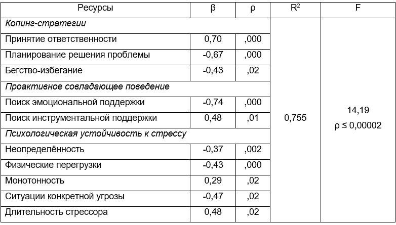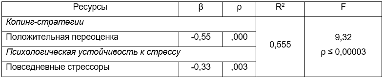 Ресурсами совладания с психологическими проблемами молодежи из России являются копинг-стратегия «положительная переоценка» (β = − 0,55, ρ < 0,001) и высокий уровень стрессоустойчивости при воздействии повседневных стрессоров (β = − 0,33, ρ < 0,01) (табл. 1). Молодежи из России снижать общий уровень проблемной нагруженности помогают хорошее совладание с каждодневными трудностями и изменение отношения к ситуации. Таблица 2 Ресурсы совладания с психологическими проблемами молодежи из Узбекистана