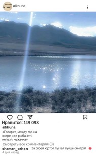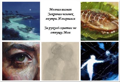 Рис. 3. Шаман после встречи с Айхуной При составлении коллажа «Шаман после встречи с Айхуной» студенты выделяют ключевые моменты в произведении; картины меняются, но цветовая гамма остаётся прежней. Первый образ – священное озеро, у которого стала жить Айхуна, изгнанная своим народом, это место встречи главных героев, второй образ – рыба из озера, приготовленная чужачкой, которая не побоялась угостить шамана и заговорить с ним за ужином. Взгляд девушки, разглядевшей в шамане человека, приковывает внимание; по центру изображена пара влюбленных – чужачка и шаман, которые несмотря на все запреты, все равно остались вместе; на третьем – родственные души (Орхан и Айхуна). Таким образом, создавая литературные страницы героев в социальных сетях, коллажи, обучающиеся визуализируют образ героя, его характер и взаимоотношения с другими персонажами. Также эти приёмы стимулируют их творческую активность, помогают им выразить свои мысли и чувства через цифровой формат. В настоящее время студентам-филологам в своей профессиональной подготовке крайне важно использовать инновационные методы подачи информации в образовательном процессе. Основываясь на примерах создания социальных страниц литературных персонажей, коллажей, можно сделать вывод, что цифровые инструменты обладают потенциалом как для получения знаний в предметной области, так и для развития ценных навыков обучающихся.