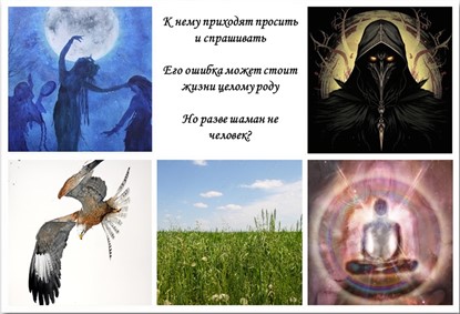 Рис. 2. Шаман до встречи с Айхуной Анализируя первый коллаж, стоит отметить, что картинка в левом углу верхнего ряда обозначает «работу» шамана – общение с духами; изображение в правом углу описывает внешний вид главного героя – он всегда ходит в повязке коршуна, никто из женщин его селения не осмеливается смотреть ему в глаза и говорить с ним – так сильно они боятся его статуса. На первой картинке нижнего ряда показано «тотемное» животное Орхана – коршун; на втором – трава в поле, так себя чувствует свободолюбивый шаман; на третьем – огромная сила главного героя, видящего прошлое, настоящее и будущее, проживающего три жизни. Именно таким представляют студенты главного героя.